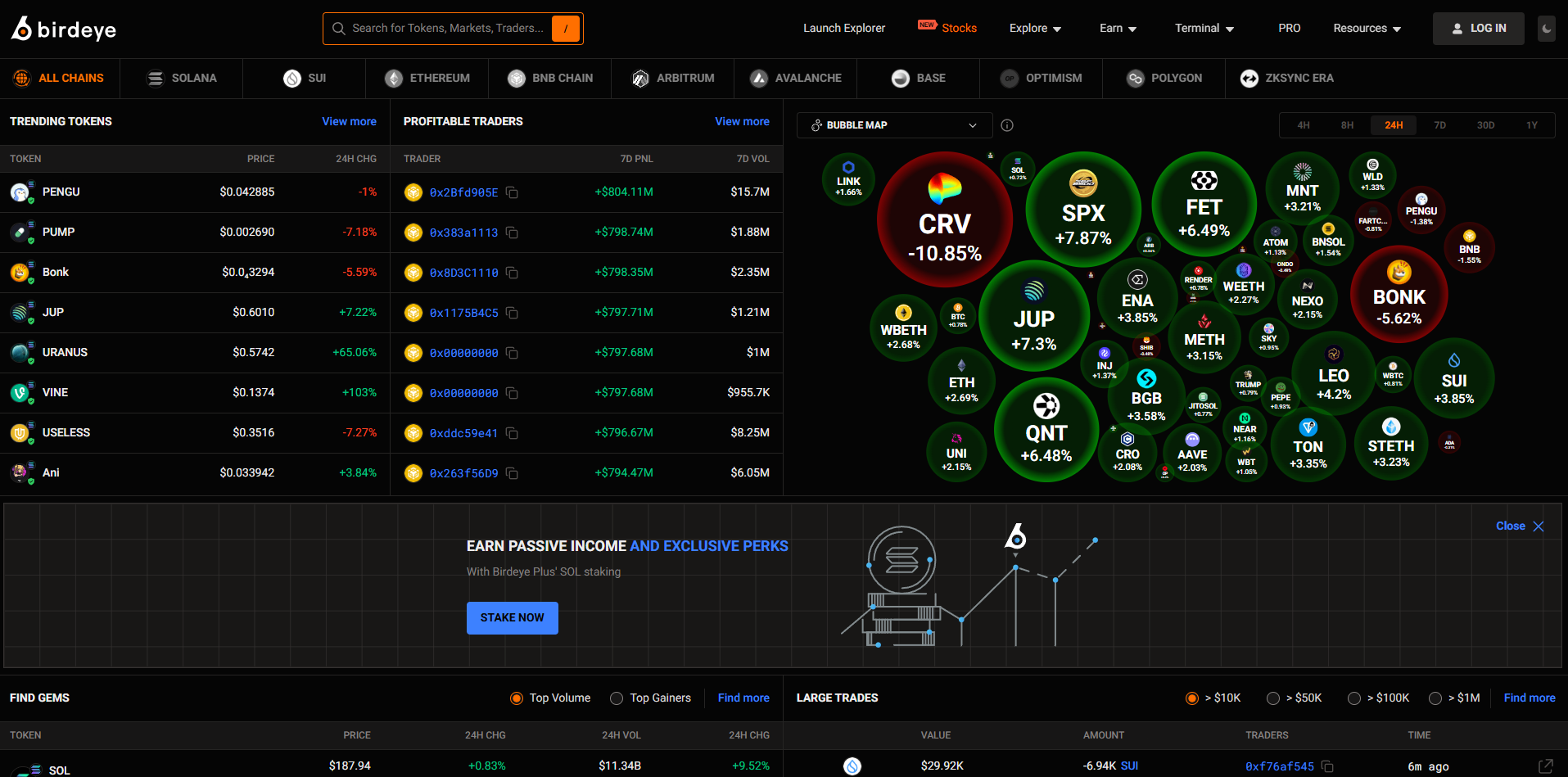 Birdeye est un agrégateur de données de trading crypto conçu pour plusieurs blockchains, dont Solana, Ethereum et Polygon. Il offre aux traders un tableau de bord centralisé affichant des données en temps réel et historiques, comme les prix des tokens, les chandeliers et les tendances de marché. Il propose des données de marché en temps réel, une analyse du sentiment des réseaux sociaux et des données de transactions on-chain. Les utilisateurs peuvent suivre la performance de différents tokens, observer l’activité de traders performants et identifier de potentielles opportunités d’investissement.
