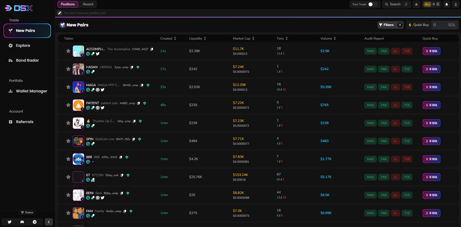 Nouvelles paires : un flux en temps réel des pools fraîchement créés avec, sur une seule ligne, l’ancienneté, la liquidité, la capitalisation, les transactions et le volume, plus un bouton « Achat rapide » en un clic.
