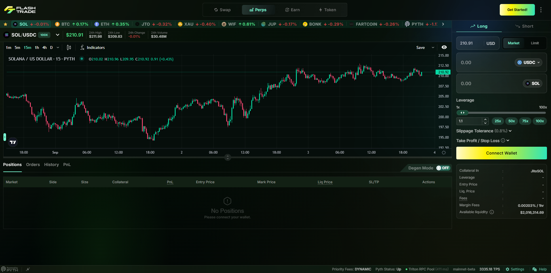 Flash Trade est un protocole décentralisé de trading de perpétuels sur la blockchain Solana, permettant de trader diverses cryptomonnaies avec un levier allant jusqu’à 100× directement depuis votre portefeuille.