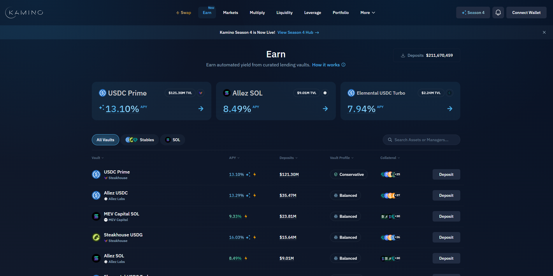 Kamino prend en charge divers actifs basés sur Solana, notamment SOL, USDC et d’autres tokens compatibles avec les DEX de Solana.