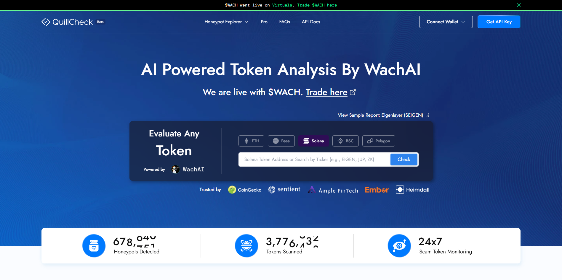 QuillCheck est un outil gratuit conçu pour protéger les investisseurs en détectant les rug pulls potentiels et les honeypots, tout en fournissant des informations sur la liquidité des projets crypto. Il aide à identifier les jetons non sûrs sur plusieurs réseaux blockchain, dont Solana.