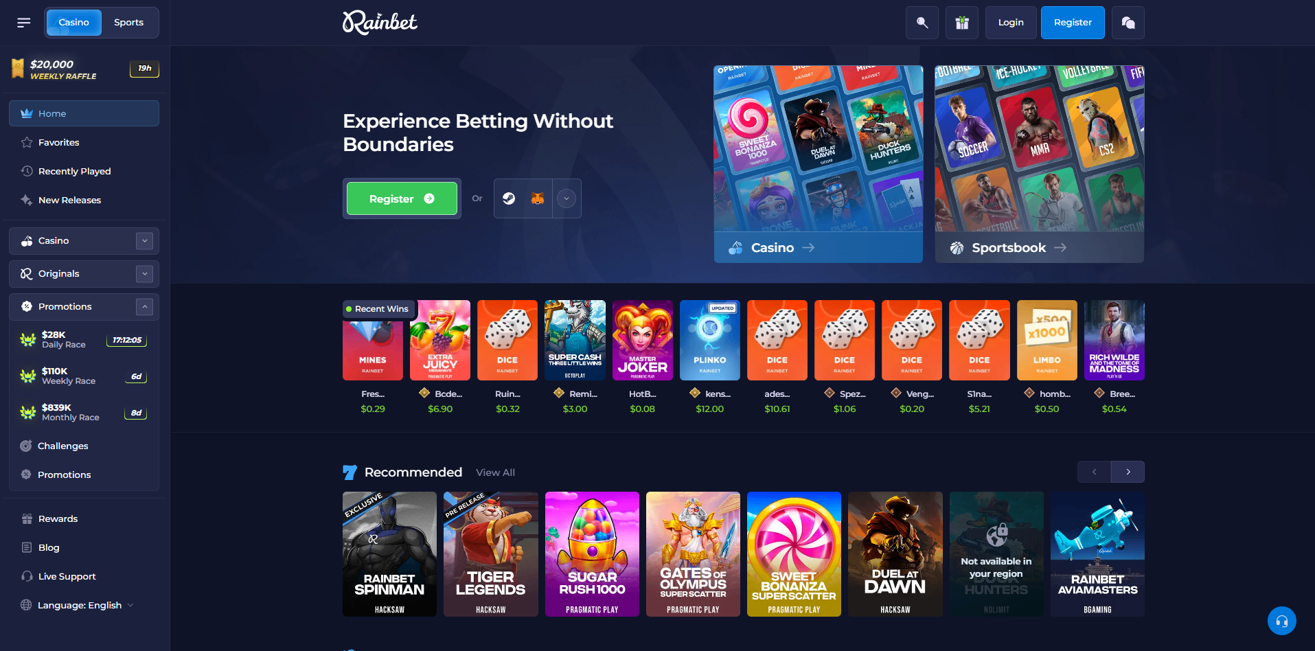 Casino (Originals + jeux de fournisseurs). Les Originals incluent des jeux maison comme Dice, Mines, Plinko, Limbo, Keno, Roulette, Hi-Lo, Crash et Blackjack, chacun conçu avec un processus de vérification provablement équitable. Le casino agrège aussi des titres de fournisseurs reconnus (par ex. Pragmatic Play, Evolution).