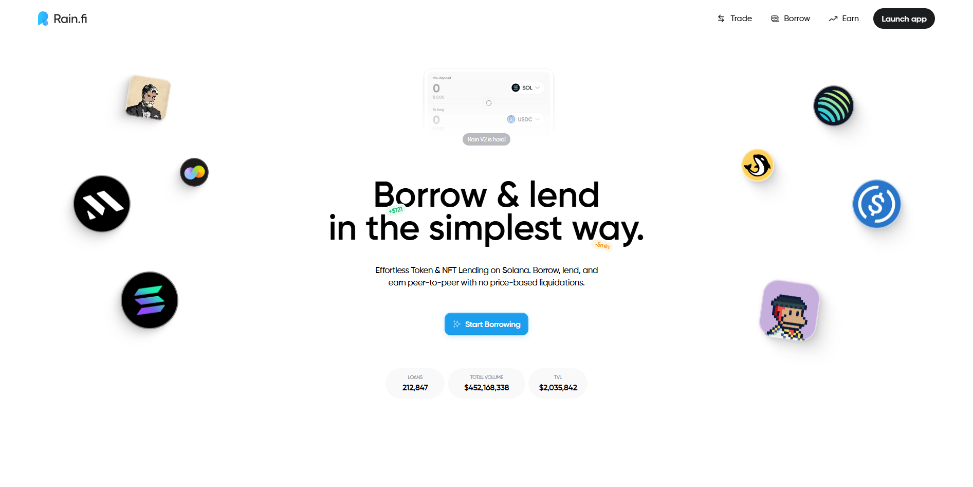 Découvrez RainFi, un protocole de prêt décentralisé sur Solana. Utilisez des NFT comme collatéral pour emprunter ou prêter des actifs numériques et gagnez des intérêts en toute simplicité.
