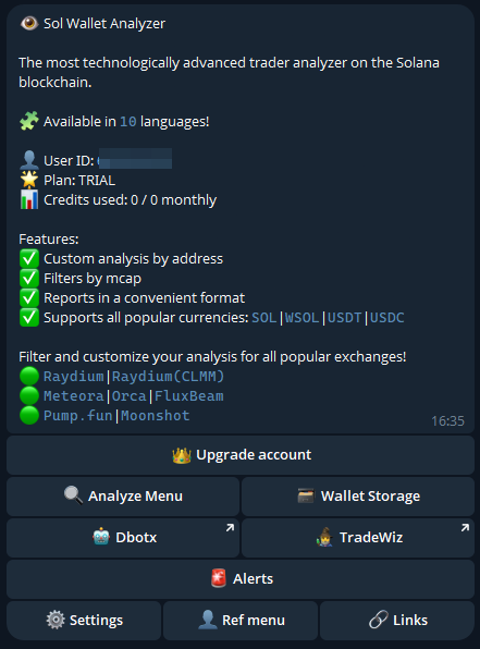 Solana Wallet Analyzer (SWA) est un bot d’analytique sur Telegram qui scanne des wallets Solana et produit des statistiques de trading claires, des métriques de risque et une ventilation de l’activité. Il est conçu pour les traders qui veulent effectuer rapidement une due diligence sur n’importe quel wallet — que ce soit pour analyser un acheteur de token, évaluer des cibles de copy trading ou comprendre leur propre performance. SWA résume gains/pertes, ROI, fréquence des trades, durées de détention, etc., avec des liens vers les principaux explorers Solana pour approfondir.