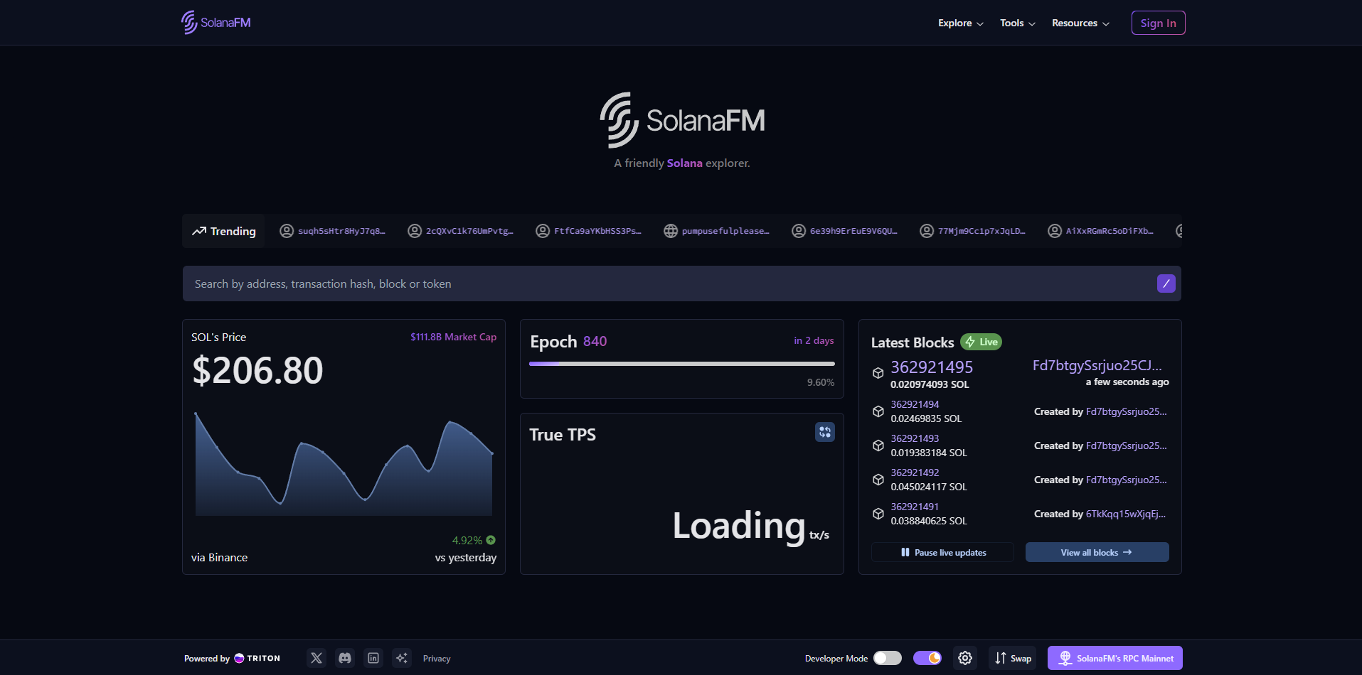 SolanaFM, un explorateur de blocs pour Solana. Accédez à des données de transactions en temps réel, à des statistiques réseau et à des API adaptées aux développeurs pour une analyse approfondie de la blockchain.