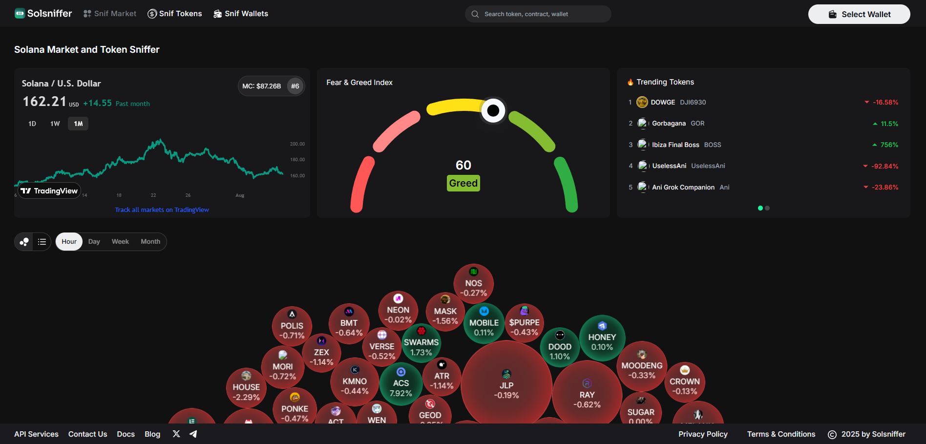 Solsniffer est conçu pour Solana dès le premier jour — et non porté depuis l’EVM —, de sorte que les fonctionnalités et les heuristiques reflètent la manière dont les tokens SPL sont lancés et s’échangent. La plateforme associe un audit de risque rapide et cliquable au regroupement (clustering) des détenteurs et à la performance des wallets dans un flux unique : scannez un token, inspectez les clusters concentrés et les liens de transfert, puis vérifiez l’historique de trading des wallets impliqués. Cette approche « Solana-first » s’étend à un tableau de bord marché et à un flux de scan léger sur Telegram pour des vérifications rapides pendant les sessions de trading.