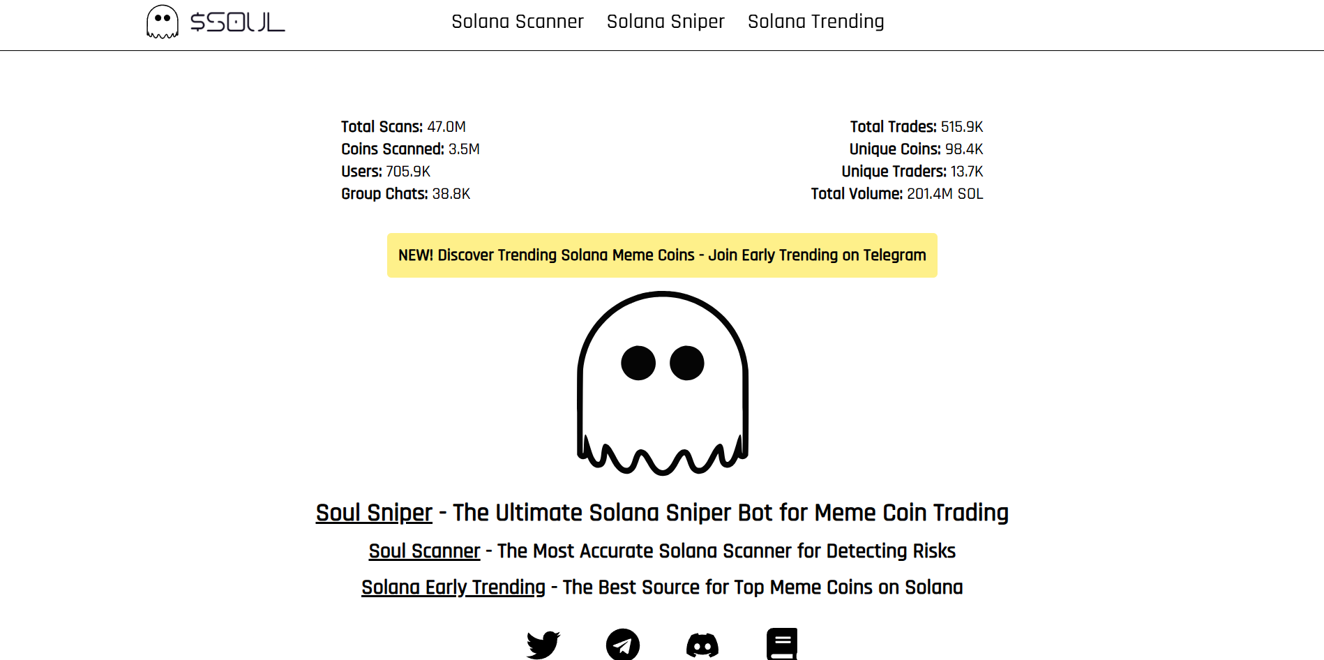 Soul Scanner est un outil d’analyse de tokens créé par Soul Sniper pour les traders Solana qui veulent lire rapidement et clairement les signaux de risque on-chain d’une pièce avant de trader. Il analyse les paramètres de mint d’un token, sa liquidité, la répartition des détenteurs et l’activité du déployeur, puis affiche des « alertes » et « avertissements » explicites afin de repérer des drapeaux rouges courants comme une mint authority non révoquée, une liquidité faible ou une propriété trop concentrée. L’outil est accessible via le web et Telegram, ce qui facilite la vérification d’une adresse de contrat partout où vous faites vos recherches ou vos trades.