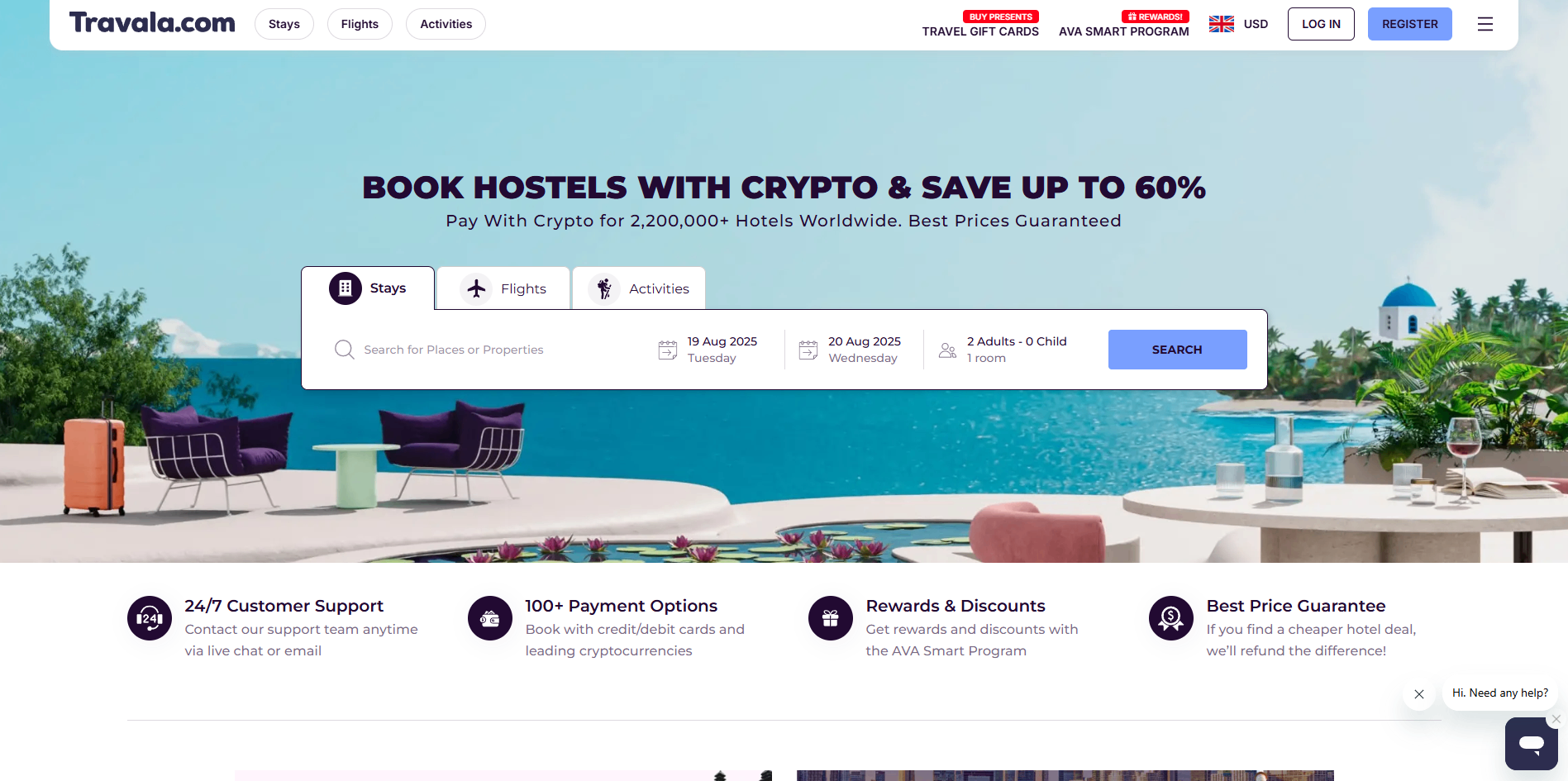 Travala est une plateforme de réservation de voyages compatible crypto où vous pouvez payer des hôtels, des vols et des activités avec Solana (SOL) ou des stablecoins sur Solana, en plus des cartes et d’autres cryptomonnaies. Le catalogue couvre des millions d’annonces dans plus de 200 pays, et le paiement propose une option Crypto → SOL simple : scannez un QR code depuis votre wallet Solana et envoyez le montant exact pour confirmer la réservation.