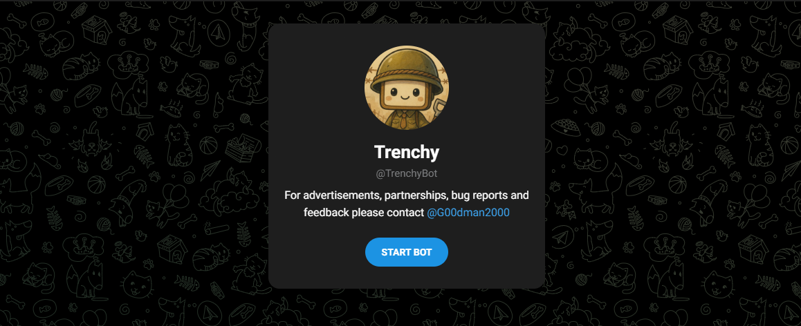 Ouvrez Trenchy dans Telegram et appuyez sur Start. Vous arriverez sur le menu principal avec des modules tels que les scans et Trench Watcher.