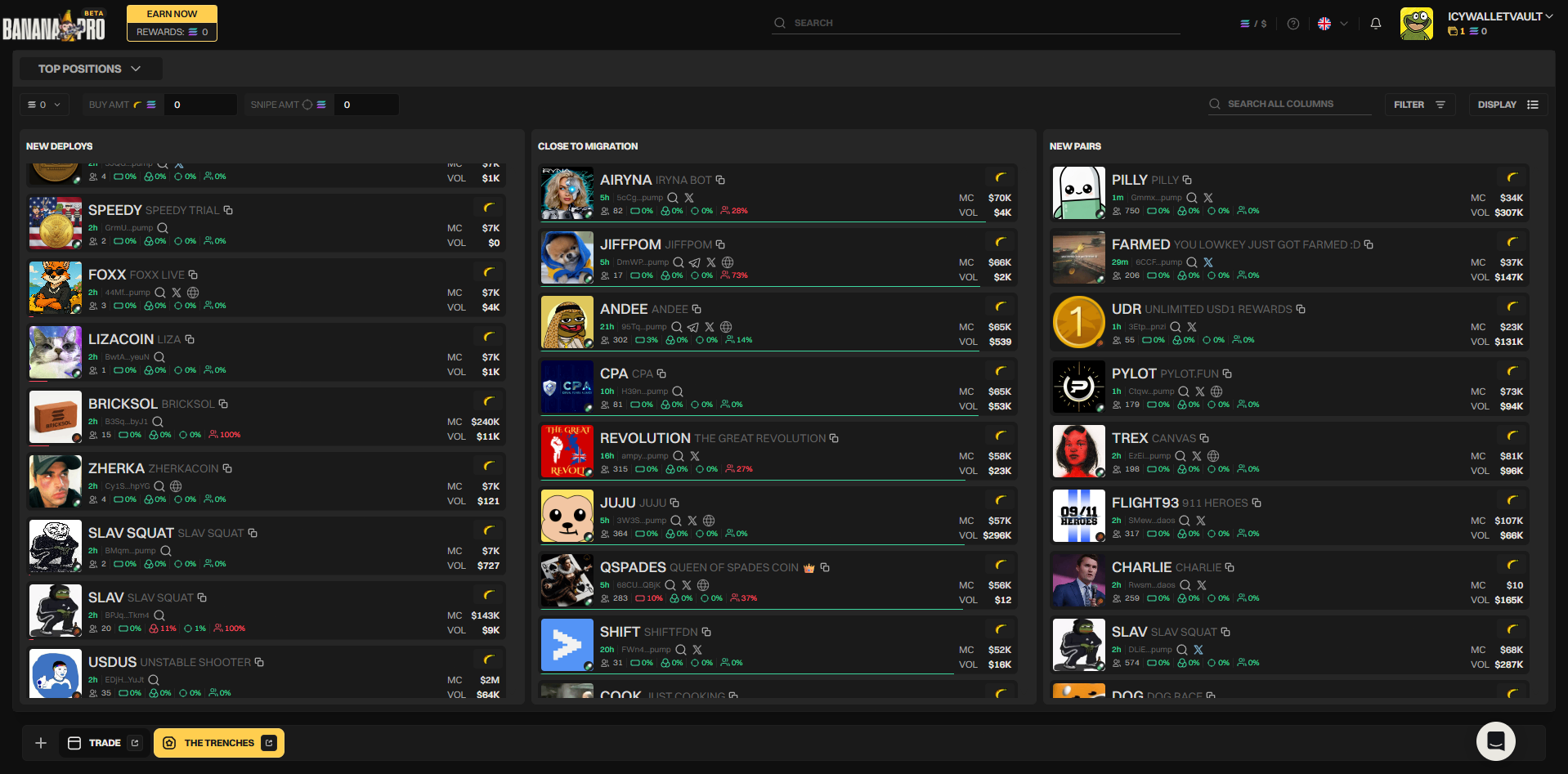 Core building blocks include a Trade page (for swaps, orders, positions, and wallet management) and The Trenches, a live feed of new tokens (e.g., PumpFun deployments, pairs close to migration, and fresh Raydium pairs). From that feed, you can research quick token stats, jump to buy/sell, or configure a snipe with MEV-aware options.