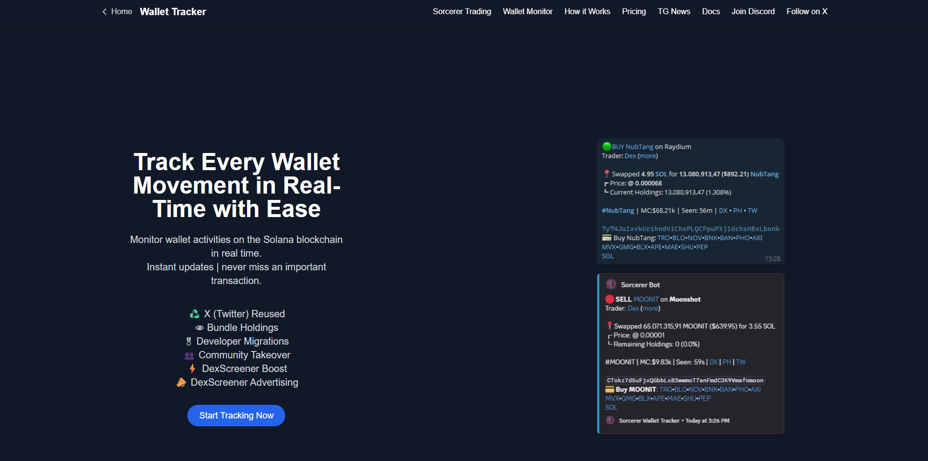 Users can integrate Sorcerer Wallet Tracker into their preferred communication platforms, such as Telegram or Discord. Once set up, the tool monitors specified Solana wallets and provides real-time notifications of their activities, helping users stay informed about significant transactions.