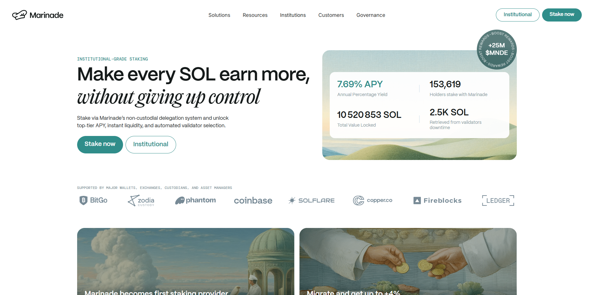 Marinade builds around reliability and security. It publishes audits, maintains a security hub, and has rolled out additional protections such as Protected Staking Rewards (PSR)—an on-chain bond system that covers certain validator underperformance events. Marinade is also SOC 2 Type I compliant, adding an external assurance layer around its internal controls. Governance runs through the Marinade DAO, where holders of MNDE can lock to gain veMNDE voting power and influence parameters like validator strategy.