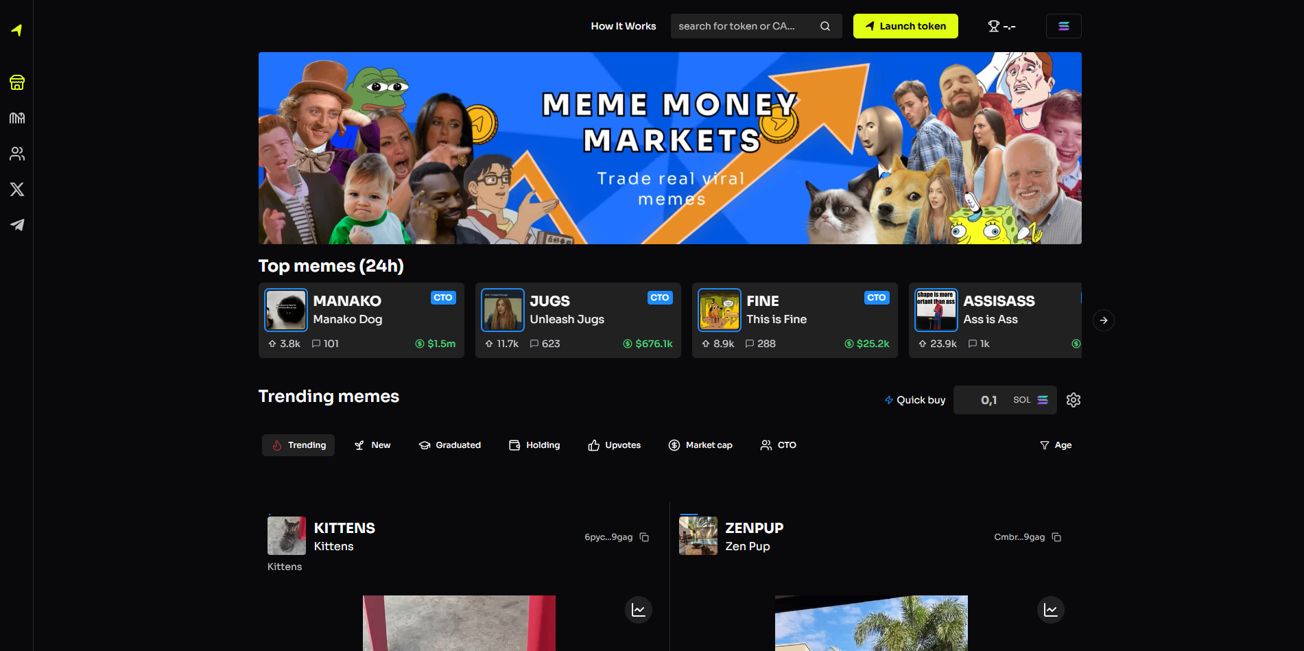 Traders who want to discover and trade culture-driven tokens with on-chain liquidity. In Meme Money Markets, memes that become viral on 9GAG are automatically launched as Solana tokens, then graduate to Meteora once they hit ~$75k market cap.