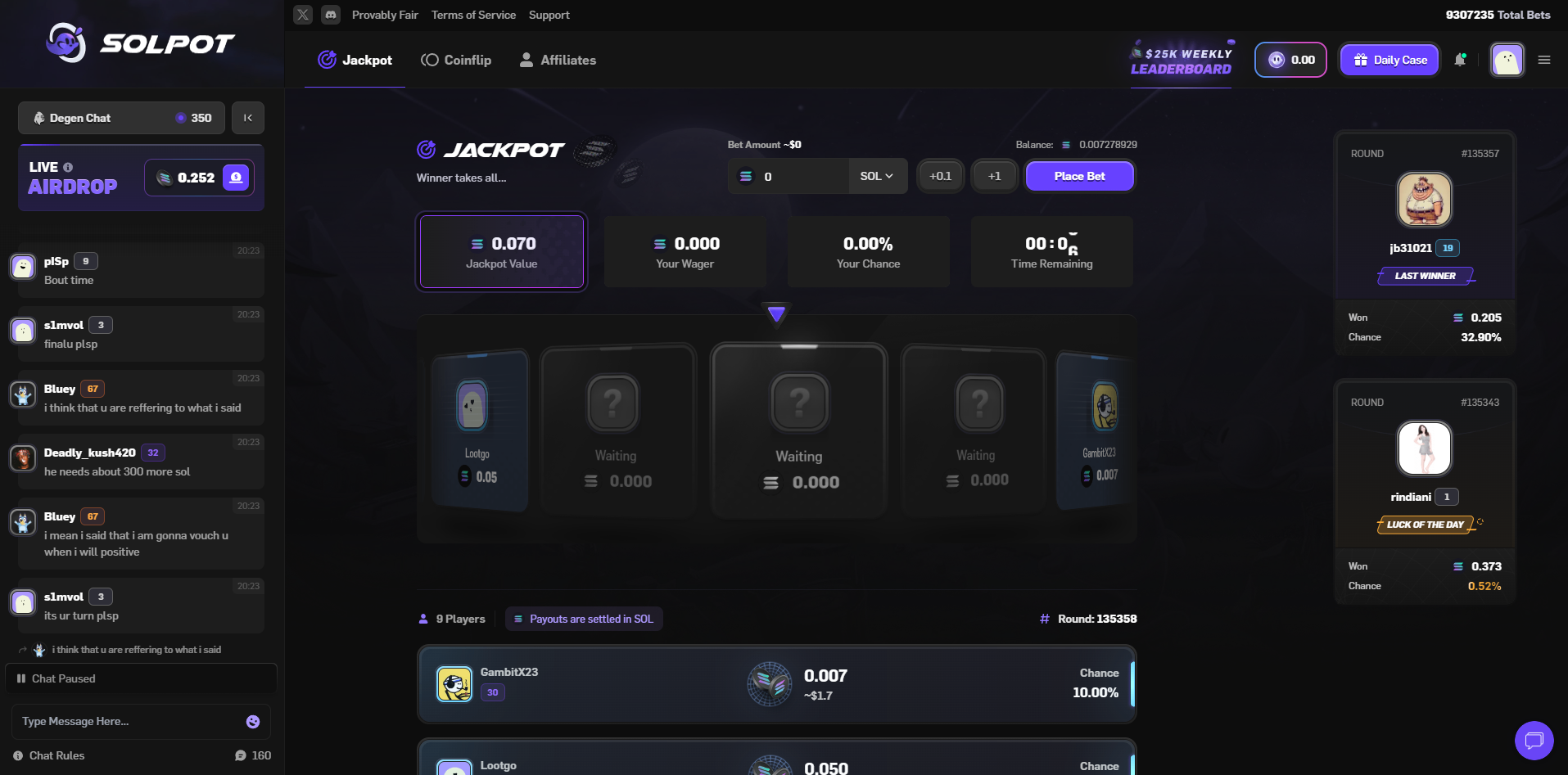 Solpot is a Solana-native gaming dApp focused on simple, on-chain games you can verify and settle directly on the network. The experience centers on two PvP game types—Coinflip and Jackpot—plus a Free Daily Solana Case promotion that requires no deposit to open. Every interaction routes through Solana, so deposits and withdrawals are handled on-chain rather than through off-chain balances. That design gives players transparent transactions and quick settlement while keeping the gameplay straightforward.